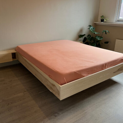 “Dankzij een heel duidelijke en gebruiksvriendelijke werktekening mét prenten slaagden mijn vriend en ik erin als volslagen leken toch een eigen bed in elkaar te timmeren. We gingen aan de slag met massief beukenhout. We lieten de nachtkastjes achterwege om er een eigen toets aan te geven, en verhoogden de poten iets meer dan aangegeven werd. Zo kunnen we opberglades onder het bed plaatsen en hebben we meer vrije ruimte in de slaapkamer. We kijken uit naar een volgend meubel dat we met een werktekening van Rob zouden kunnen vervaardigen. Heel tof en uniek concept!”